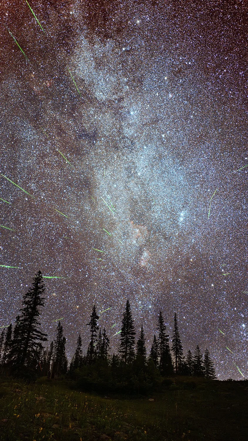 Night sky filled with stars, the Milky Way galaxy visible, and shooting stars with a silhouette of a forest of tall pine trees at the bottom at Grand Mesa National Forest in western Colorado.