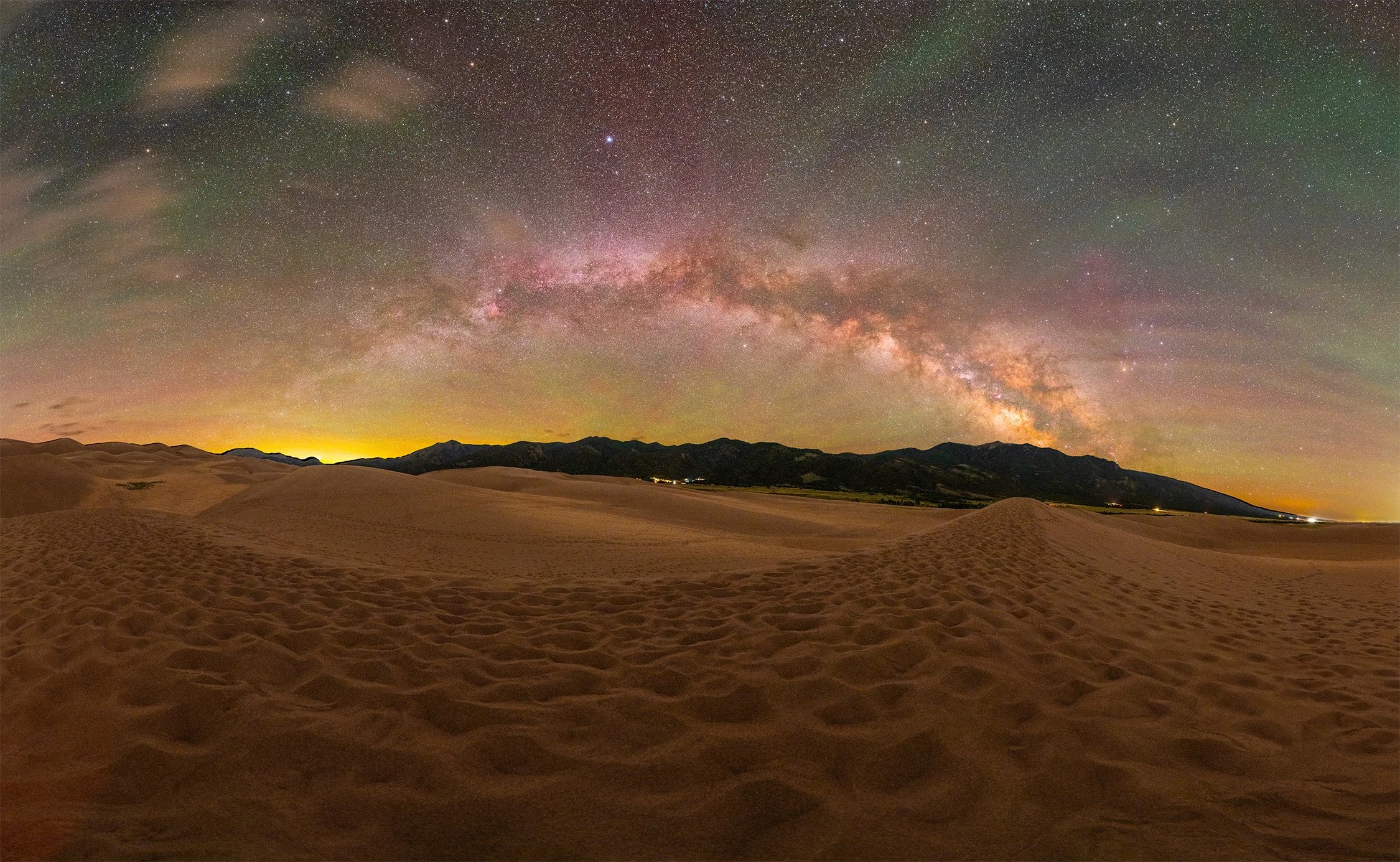 Nighttime desert landscape with pink sand dunes, mountain range silhouette, star-filled sky, and the Milky Way galaxy at Great Sand Dunes National Park.