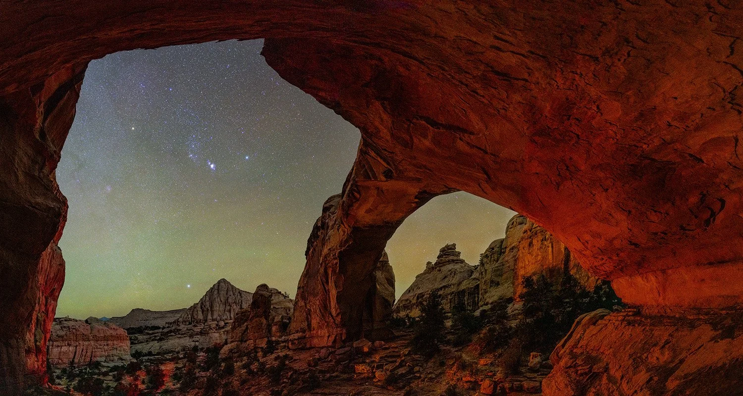 Nighttime view of a desert landscape with a natural rock arch, starry sky, and some distant rock formations in Capitol Reef National Park.