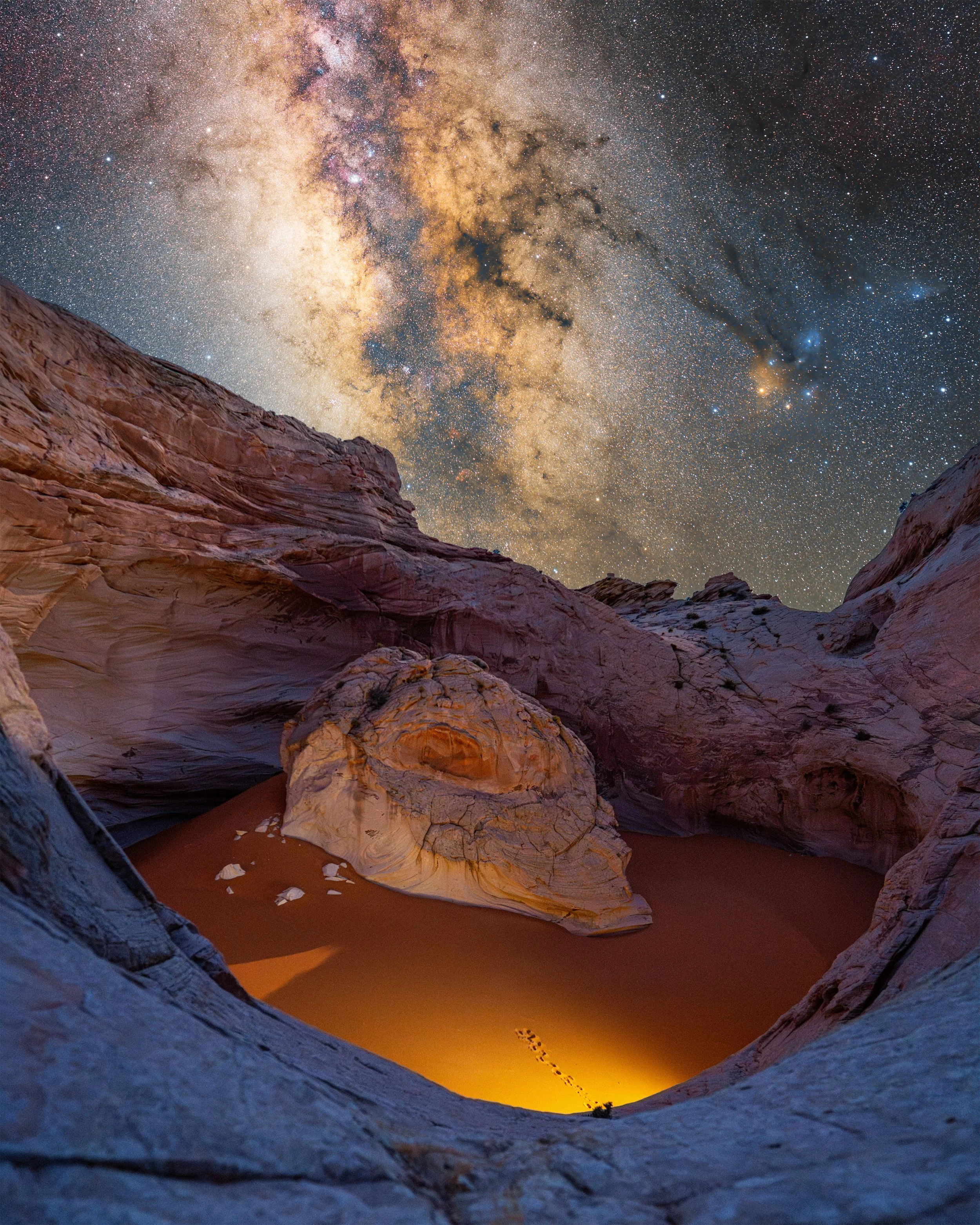 Nighttime view of a canyon with layered, colorful rock formations under a star-filled sky and the Milky Way galaxy overhead at the Wave in Northern Arizona.