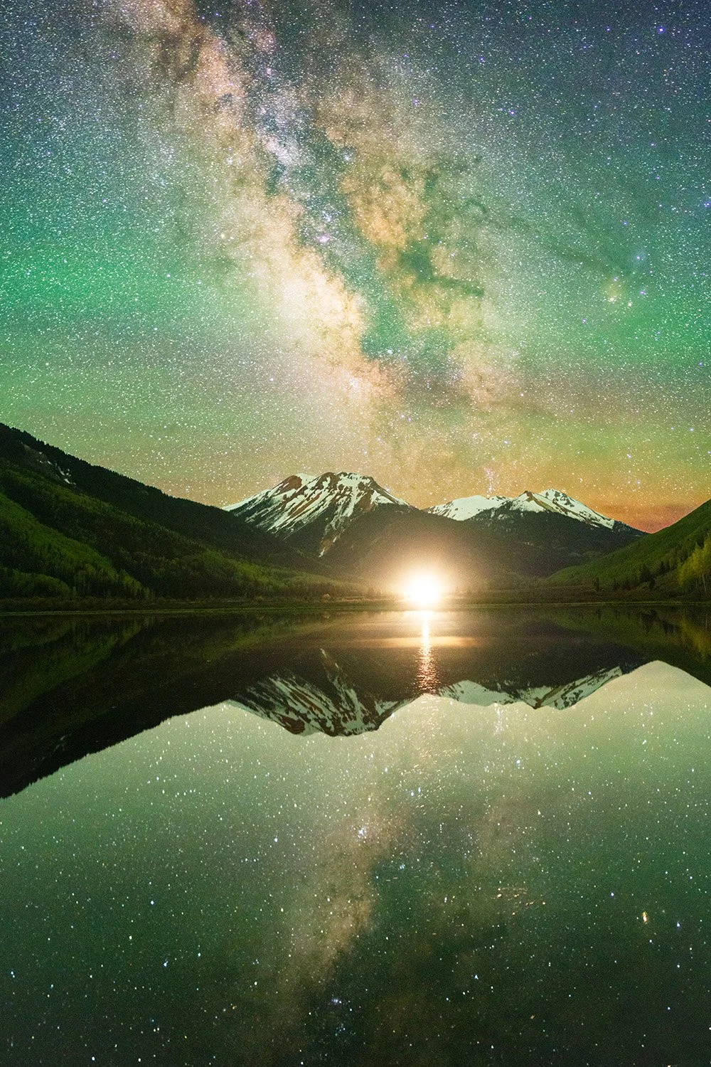 Night sky filled with stars and the Milky Way galaxy above snow-capped mountains, with a bright light near the horizon reflecting on a still lake in western Colorado.